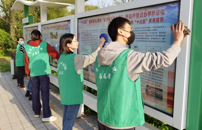 活动中,每一位党员同志充分发挥党员的先锋模范作用,身穿绿色马甲积极参与,手持扫把、抹布、水桶,哪里脏去哪里,或俯下身,捡拾绿化带里的白色垃圾、雪糕棍、纸屑,或弯着腰,擦拭公告栏。2018级研究生预备党员王涛、姚振中等人还着重对垃圾桶以及附近进行了全面地酒精喷洒消毒……每一个“匆忙”的身影都在挥洒着劳动的热情,每一份撸起袖子加油干的劲头都化作保护地球的力量。