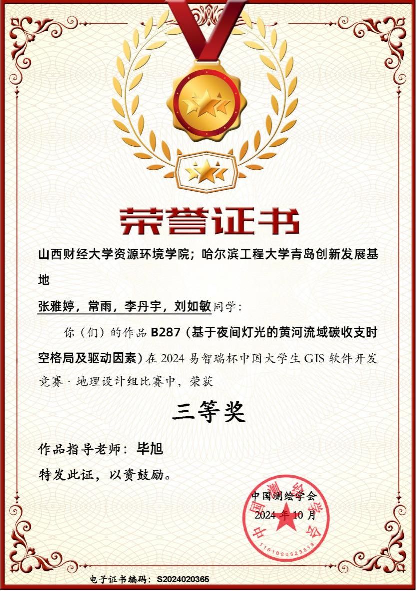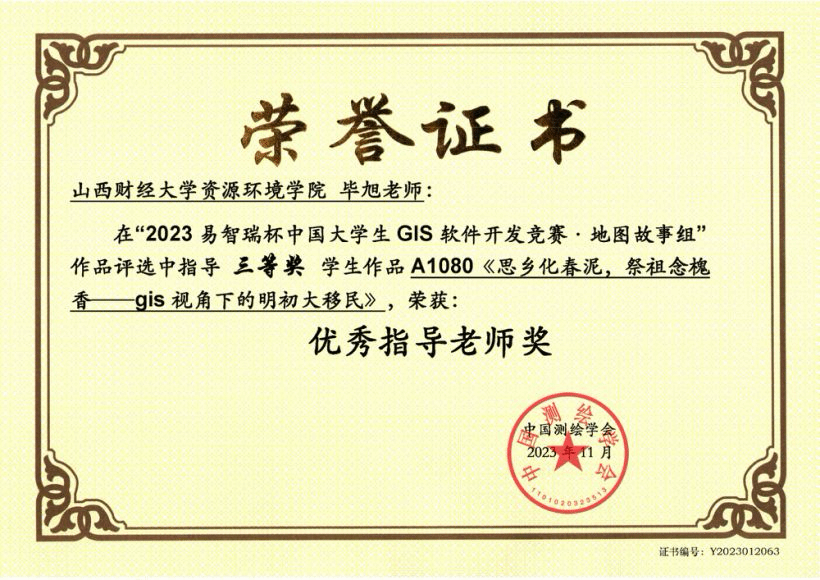 在培养高素质GIS人才方面所取得成绩的认可。指导教师毕旭老师荣获“优秀指导老师”奖项,她的专业指导和无私奉献为团队成功奠定了坚实的基础。