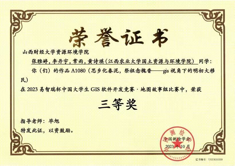 2021地理信息科学专业张雅婷、常雨、李丹宇三位同学的作品《基于夜间灯光的黄河流域碳收支时空格局及驱动因素》荣获地理设计组三等奖。其中,该团队成员在2023年“易智瑞杯”中国大学生GIS软件开发竞赛中作品《思乡化春泥,祭祖念槐香——gis视角下的明初大移民》荣获地图故事组三等奖。以上荣誉不仅是对团队成员辛勤付出的肯定,更是对汤姆视频