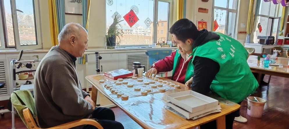 棋盘之上,红黑棋子交相辉映,每一步进退之间都蕴含着智慧与谋略。伴随着棋子落下的轻微声响,老人与志愿者运筹帷幄、在方寸棋盘上排兵布阵,展开了一场场激烈而精彩的对决。在这静谧的房间内勾勒出一幅跨越年龄界限的温馨画面,情谊随着棋局的进展而逐渐升温,温暖的气息弥漫在每一个角落。