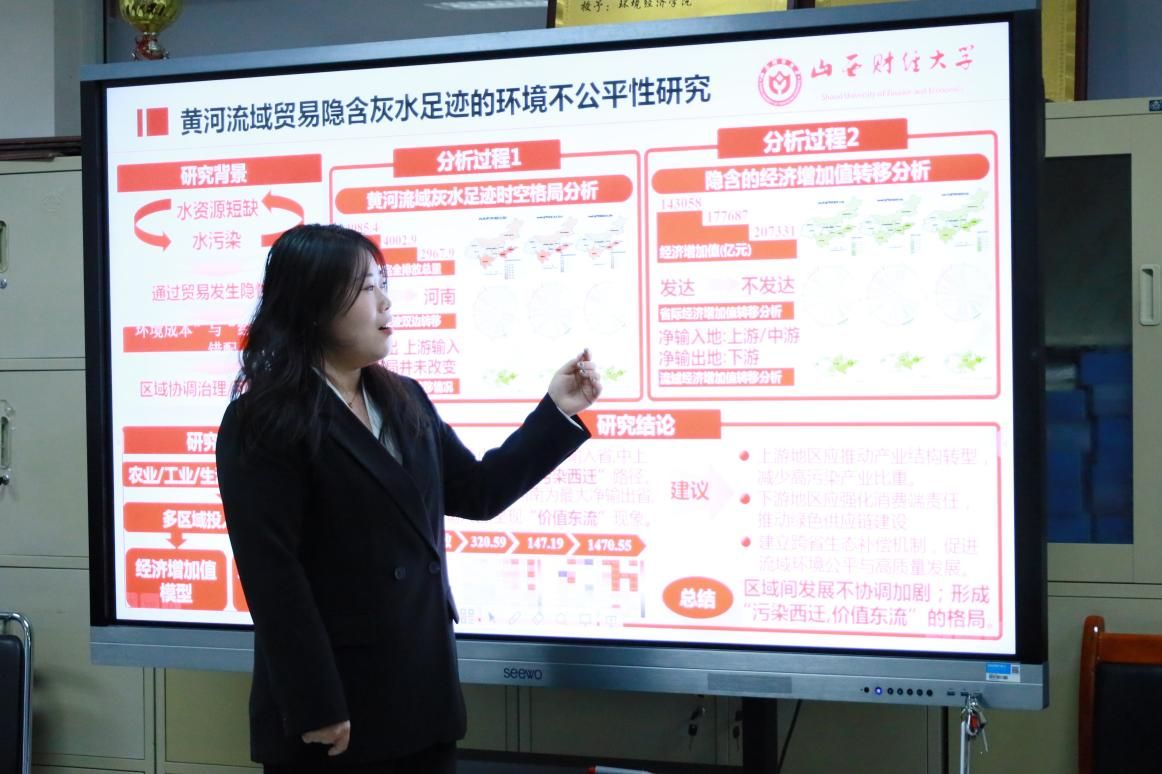 其中,2024级柴艺同学以《黄河流域贸易隐含灰水足迹的环境不公平性研究》为题,表达逻辑清晰、问题意识突出,体现出对流域协同治理的深入思考。2024级韩越梅同学聚焦《长三角地区PM2.5与O3健康风险及其联防联控分区研究》,其研究为长三角跨区域大气联防联控提供了科学依据,体现出较强的政策关联性与实践导向。各位参赛选手均展现出了良好的学术素养与研究能力,他们力争做到重点突出、语言凝练,在严谨表达的基础上清晰传达研究的核心逻辑与社会意义。