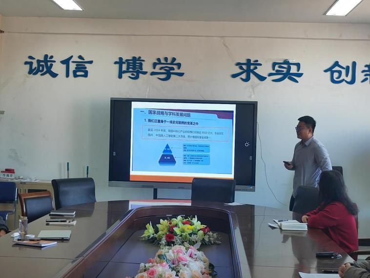 分享会上,程鹏、李涛、王晨光三位教师分别围绕大会主题,从理念解读、案例分享和路径提炼等方面进行汇报交流。大家结合自身教学科研实践,将会议精神转化为专业建设和课堂改革的具体思路。程鹏老师聚焦“数智时代地理科学类专业教育重构”,从“数智赋能、交叉融合、创新驱动”三个维度进行解读,强调要以AI和大数据为抓手重塑人才培养目标与课程体系,打通地理学与相关学科的交叉通道,把创新能力培养贯穿本科全过程。李涛老师重点展示了AI赋能地理教学的典型做法,结合汤国安教授、宋长青教授等专家案例,介绍智能可视化、空间大数据分析等在课堂中的具体应用,并围绕如何提升课堂吸引力、强化学生实践能力提出了可操作的改进建议。王晨光老师围绕“一流专业建设的综合提升路径”,重点分享兄弟高校在科研反哺教学、凝练学科特色、实践育人、课程思政、AI素养融入、对接地方战略和建设精品课程群等方面的先进做法,对学院地理学科发展具有借鉴意义。