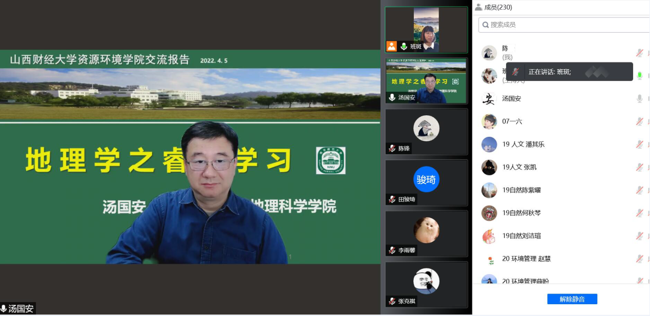 院长班凤梅教授邀请,教育部地理科学类专业教学指导委员会副主任、国家教学名师、南京师范大学汤国安教授为我校师生作了题为“地理学之睿智学习”的线上交流报告。报告会由班凤梅教授主持。汤姆视频