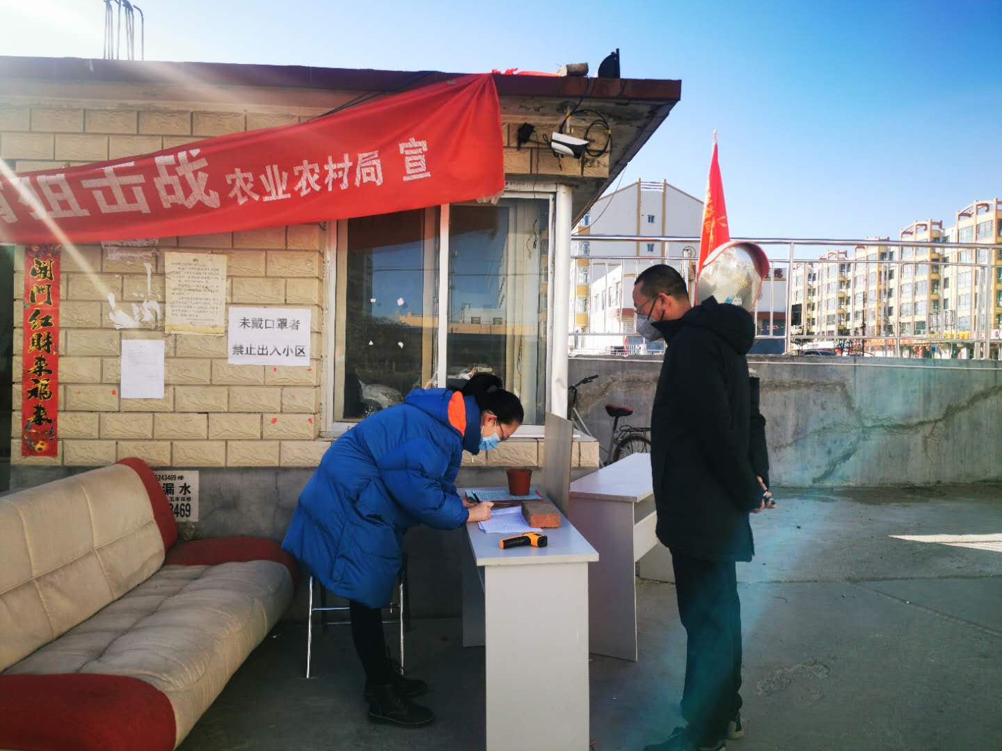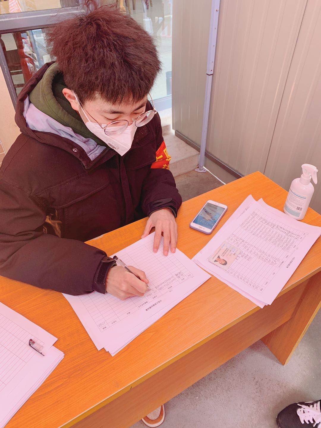 作为一名班干部,主动请战,加入阳高县疫情防控工作,服务龙泉小区东西两区,主要的工作任务是记录每日东西两区人员出入情况,劝返外来人员,对东西两区成员进行进出人员体温测量。她说“非典时期我还是一个孩子,现在长大了,应该为社会贡献自己的一份力量”。